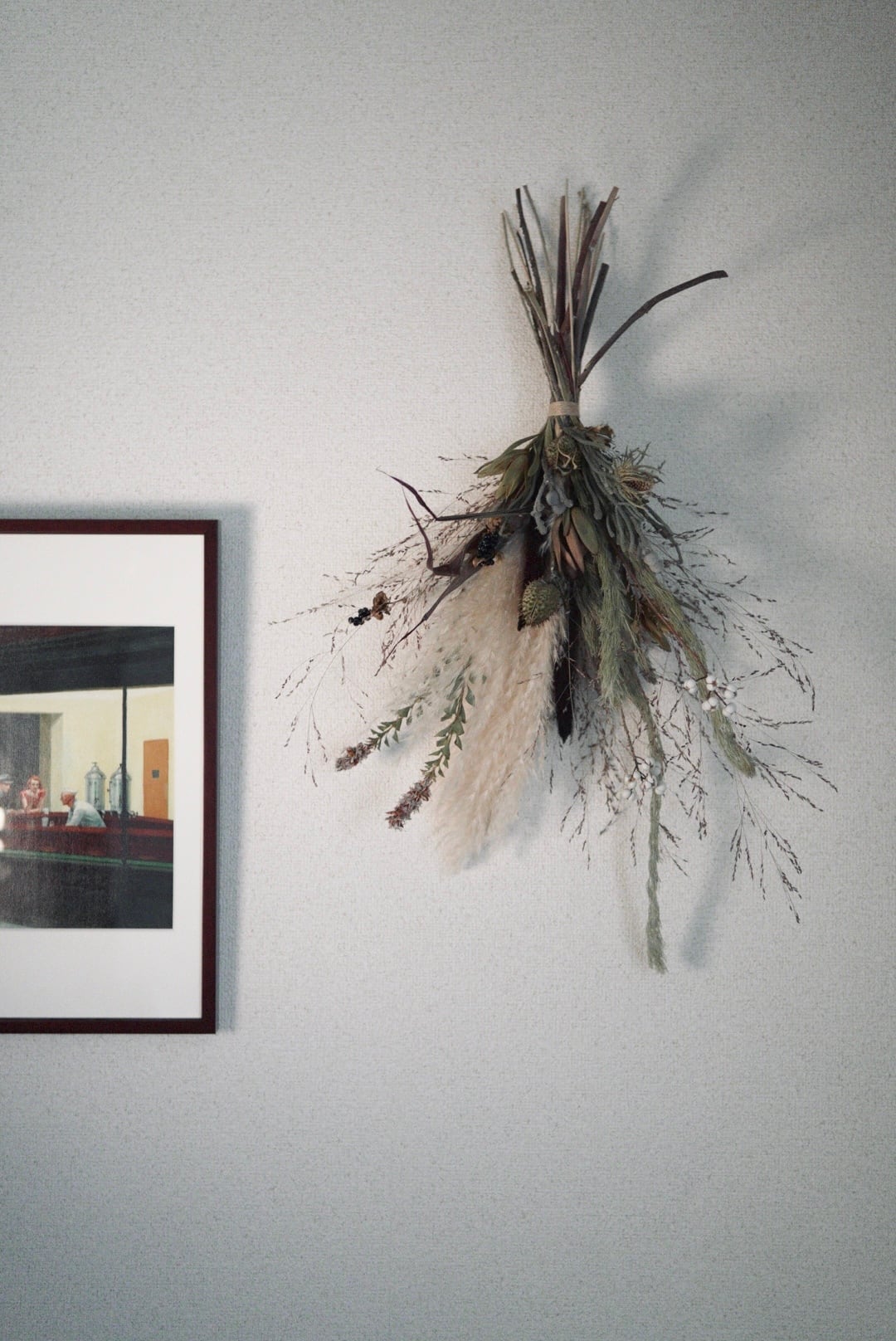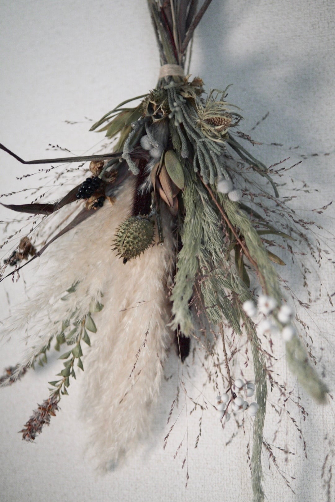 ドライフラワーの色合いは、夏の名残と秋の静けさをひとつに閉じ込めたようです。