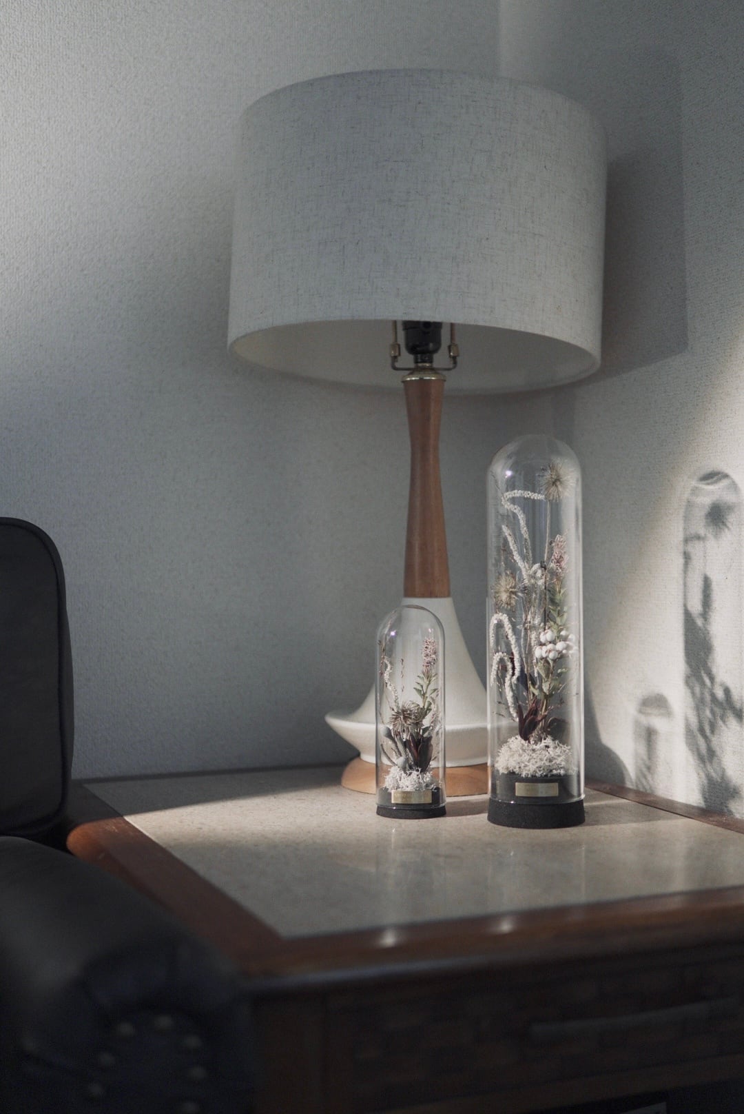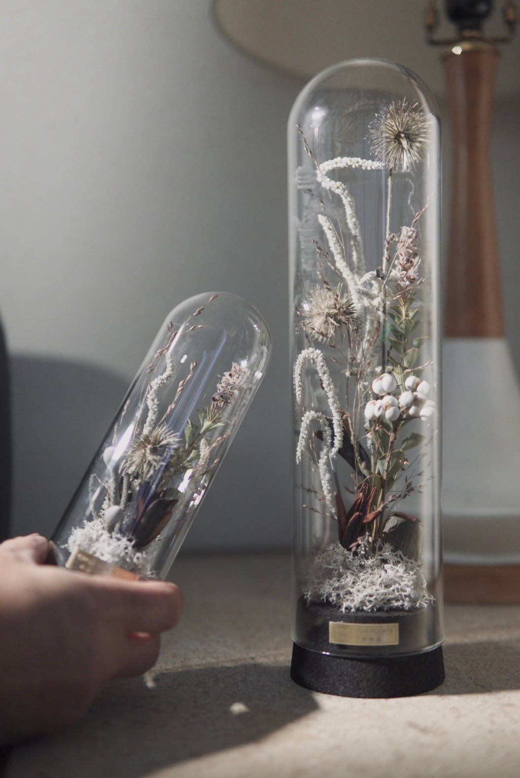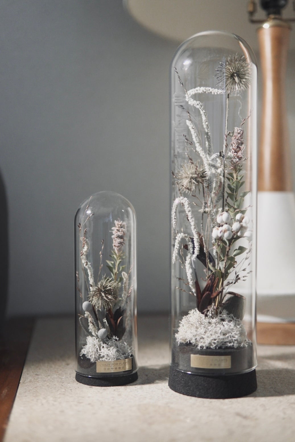 なかや植物店らしい色味をおさえたシックな印象のドライフラワードームとなります。