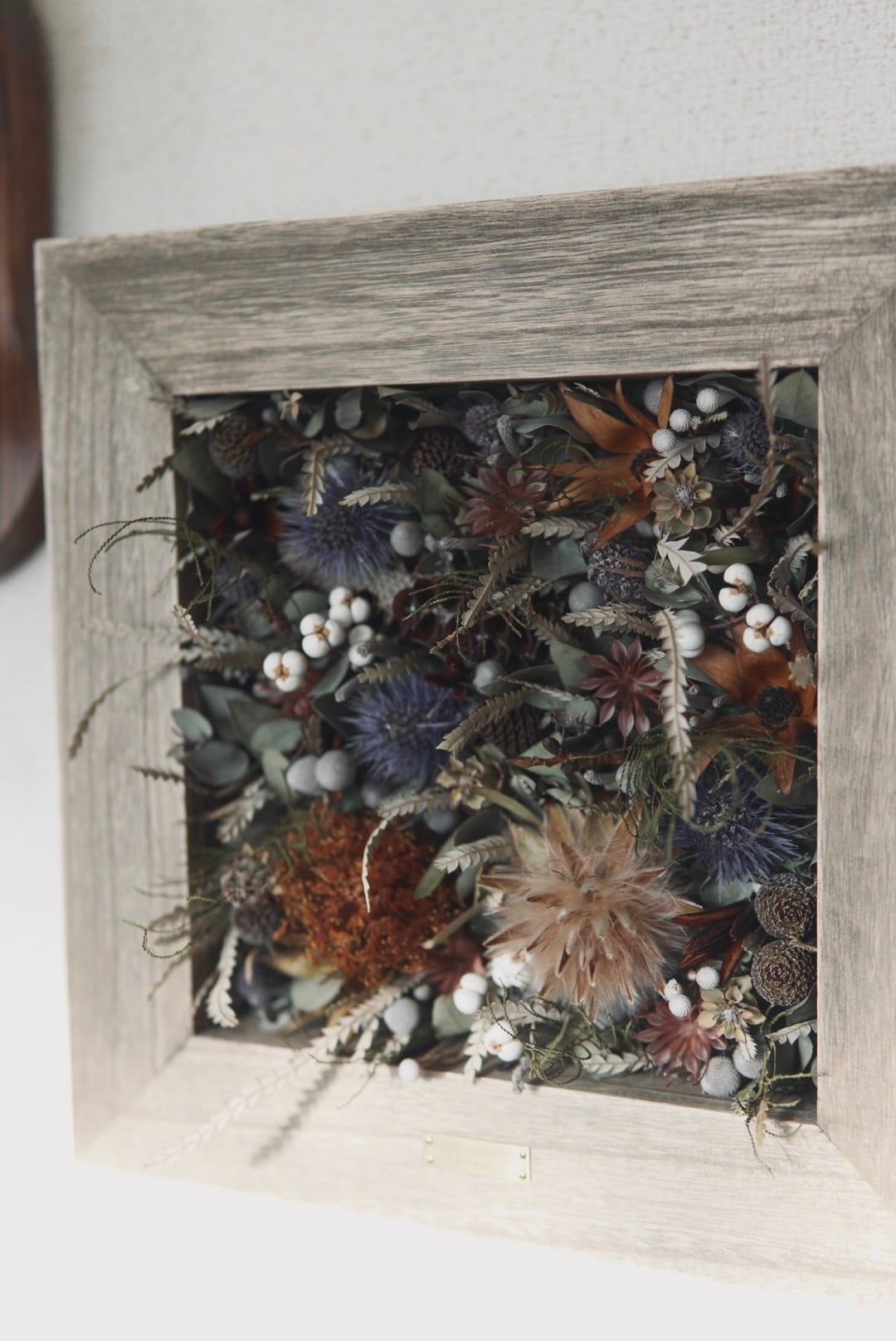 壁掛けで飾りやすいドライフラワーのフレームアートです。